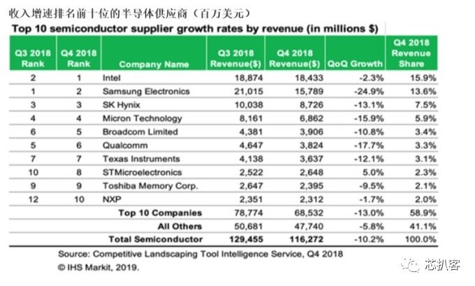 IHS Markit 半导体制造高级分析师Ron Ellwanger 表示,去年第4 季,半导体销售额出现明显变化,主要是因三星手机销售放缓,储存晶片单价与营收大幅减少,造成三星第4 季半导体销售额季减24.9%。